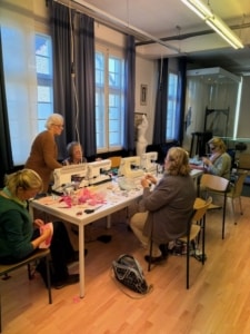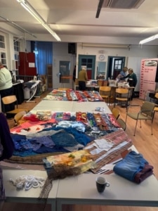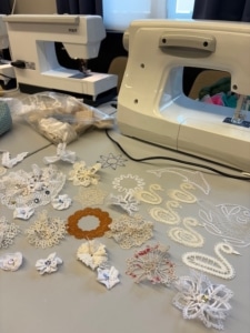 Onder de bezielende leiding van Tineke Geurts kregen we uitleg over het project en werden de taken verdeeld. In een ontspannen en rustige sfeer werd er gepuncht, genaaid, gehaakt, kantwerk voor sneeuwvlokjes uitgezocht (mijn taak). Kortom, lekker gewerkt. De dames gingen ’s middags nog door om zo steeds meer vorm aan dit voor Horst bestemde deel van het kunstwerk te geven.