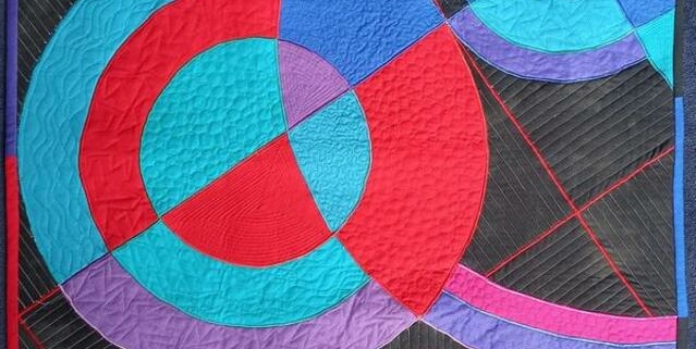 Nu volgt de kleurkeuze. Ik wil dat het rode lapje in iedere cirkel aanwezig is en bovendien prominent aanwezig in de grootste. Best moeilijk, want dit rood slaat een beetje dood bij andere kleuren. Ik moest dus knallen met de andere kleuren en moest er voor zorgen dat ik geen enkele kleur van zijn “quilt-broer” zou gebruiken. Het moet een zelfstandige quilt worden. Nu de andere kleuren uitgezocht. Daarbij kies ik ook vaak voor een zwarte achtergrond. Niet omdat ik een depressief mens ben, maar omdat de kleuren daar het sterkst op uitkomen. Veel wikken en wegen, maar ik ben tevreden.