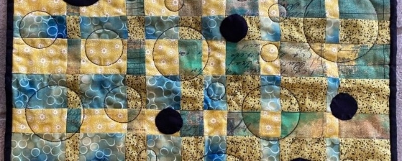 En werd de quilt van Marijke verlevendigd met grote en kleine cirkels, die ook in het quiltwerk terugkomen (met excuses voor de scheef genomen foto, de quilt zelf is hartstikke recht 😊).