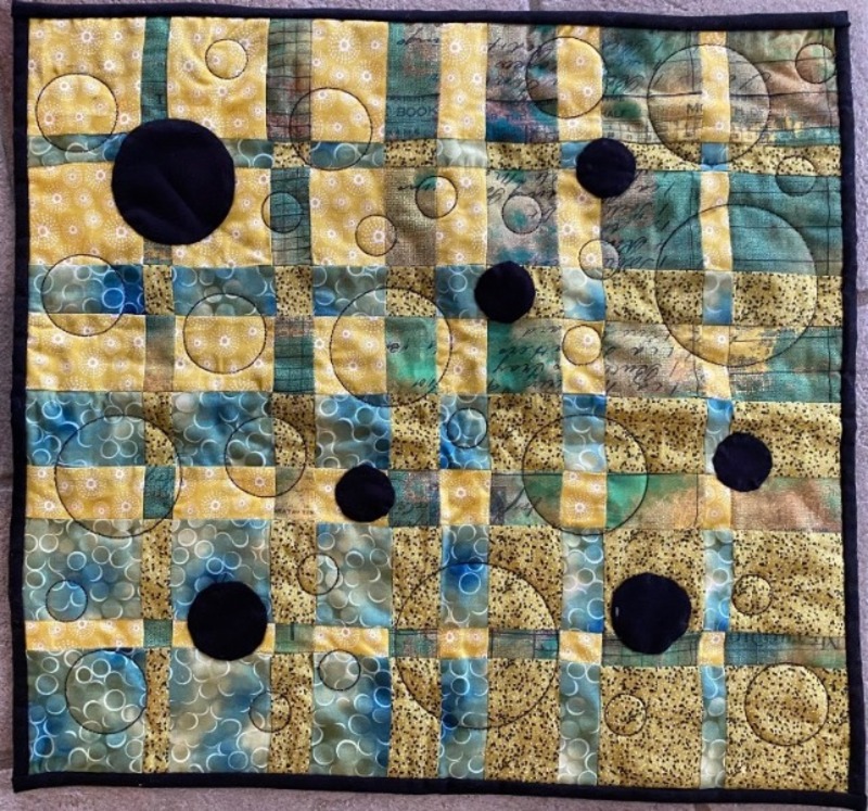 En werd de quilt van Marijke verlevendigd met grote en kleine cirkels, die ook in het quiltwerk terugkomen (met excuses voor de scheef genomen foto, de quilt zelf is hartstikke recht 😊).