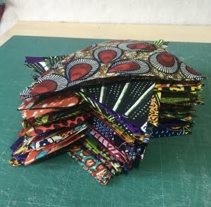 - Maak een stapeltje van vlaggetjes van steeds twee stukjes stof met de goede kanten op elkaar.