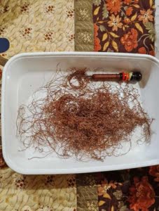 Ik had iets van een uur zitten stikken aan de versie van het raster dat ik niet mooi vond. In die tijd had ik de binnenrand van bijna 1,5 zijde doorgestikt met het raster. Het heeft mij twee avonden gekost om dat allemaal weer uit te halen. Ach, Netflix aan, pot thee erbij, scherp tornmesje en gaan met die banaan. Dit bleef er over van die noeste arbeid.