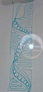 Ik vind het zo bijzonder hoe je tijdens het quilten je gedachten de vrije loop kunt laten en hoe je dan kleine hints kunt uitwerken tot volledige ideeën. Zo vormde zich tijdens het meanderen een idee over hoe ik de buitenrand wilde gaan maken. Een soort zaadlijst omgeven door een intensiever raster. En ja, weer het bordje erbij gepakt om te kijken wat er voor nodig was qua heen en weer bewegen om de vormen in een doorlopende lijn te kunnen maken.