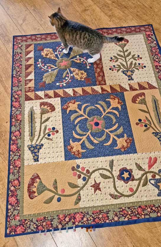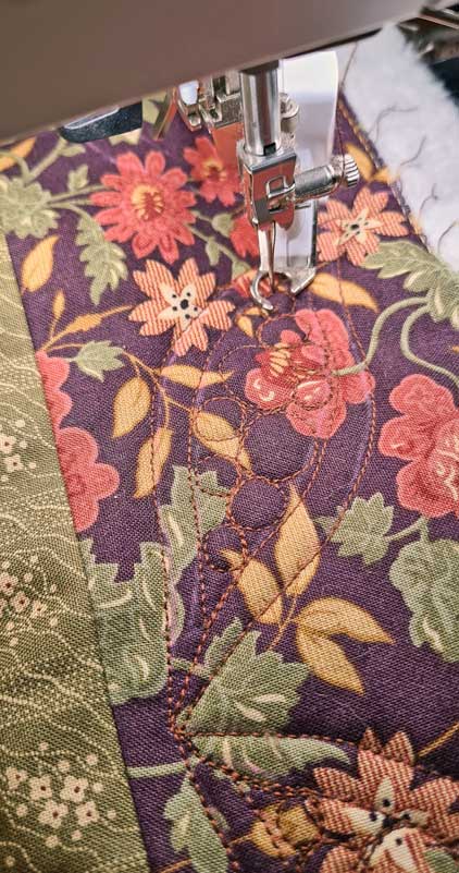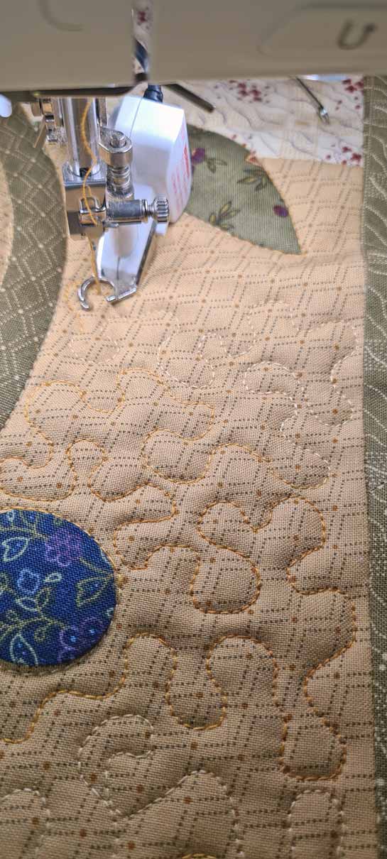 In de zomer van vorig jaar ben ik begonnen aan de Hawthorn Ridge quilt naar een patroon van Jan Patek. De laatste tijd heb ik aardig wat productie gedraaid en dat geeft mij de ruimte om makkelijk van project te wisselen. De ene keer heb ik zin in appliqueren met de hand, de andere keer in lekker blokken achter elkaar naaien. En de afgelopen periode ben ik toegekomen aan het machinaal doorquilten van de Hawthorn.