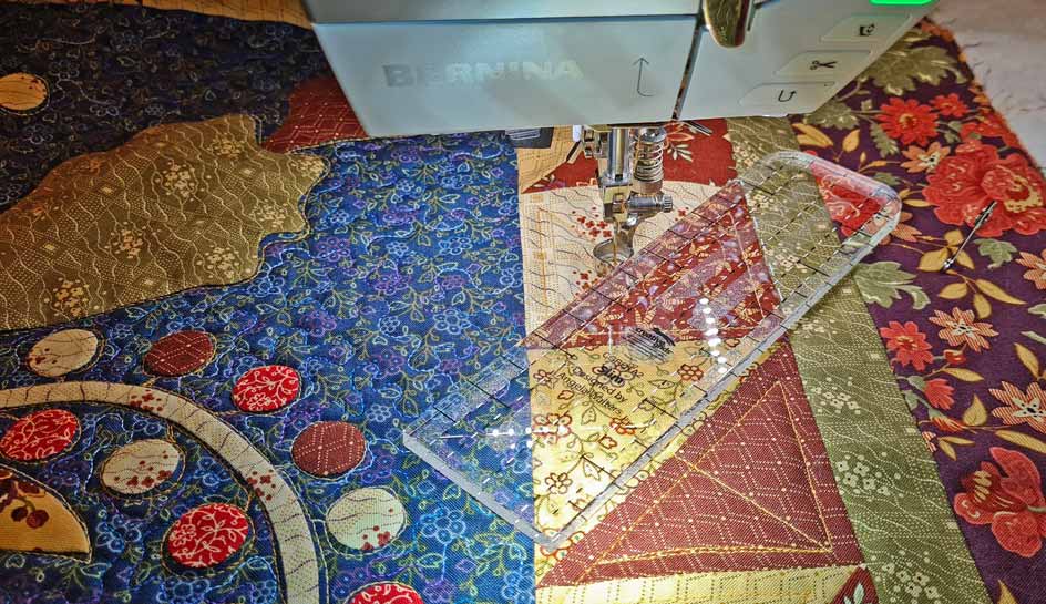 De tussenrandjes met de driehoeken wilde ik niet met datzelfde patroon doorquilten. Ik vind het leuk als er bij het machinaal doorquilten rekening wordt gehouden met de inhoud van de blokken. Dus kwam het whitebordje er weer bij. Ik heb het niet al te ingewikkeld gemaakt. Na een hoop geteken had ik een patroon dat ik bijna in een doorlopende lijn kon stikken voor de blokken. Er was 1 stukje dat steeds dubbelgestikt moest worden. In het grote geheel valt dat helemaal weg. Ik vond het prima.