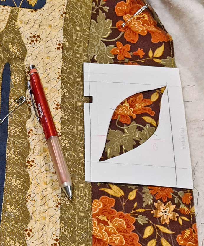 Met dat vormpje wilde ik wel zeker weten dat ze op elkaar zouden lijken. Dus koos ik om een sjabloon te maken. Ik heb eerst opgemeten hoe lang de randen waren en gekeken hoeveel ruimte ik aan begin en einde over moest laten zodat alle restruimte goed verdeeld was. Het vormpje heb ik heel simpel getekend op dubbelgevouwen freezer paper dat op elkaar gestreken was. Stevig genoeg en makkelijk op te tekenen en uit te knippen. Ik heb een paar vaste punten aangegeven, zodat ik zeker wist dat ik het vompje steeds op dezelfde manier kon neerleggen op de stof. Als steunpunt heb ik de naad van de rand gebruikt (het groen en bruin). Zoals je kunt zien heb ik een stukje weggeknipt zodat ik makkelijk kon zien of het vormpje goed op de lijn lag.