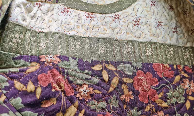 Nadat ik die eerste vormen had gequilt was het tijd om dat raster van die tussenlijntjes te starten. Na een eerste stuk begon het te knagen: ik vond het niet mooi. Het was op de een of andere manier wel ok, maar toch ook storend. De ruimte tussen de strepen had ik niet regelmatig genoeg gehouden en er zaten best wel wat schuine strepen tussen. Ook de kleur – bruin, net als die vormen – maakte het groene stofrandje te somber. Dus verder experimenteren. Met groen garen dit keer en in plaats van links naar rechts ben ik de randjes gaan stikken van boven naar beneden (vooruit – achteruit).