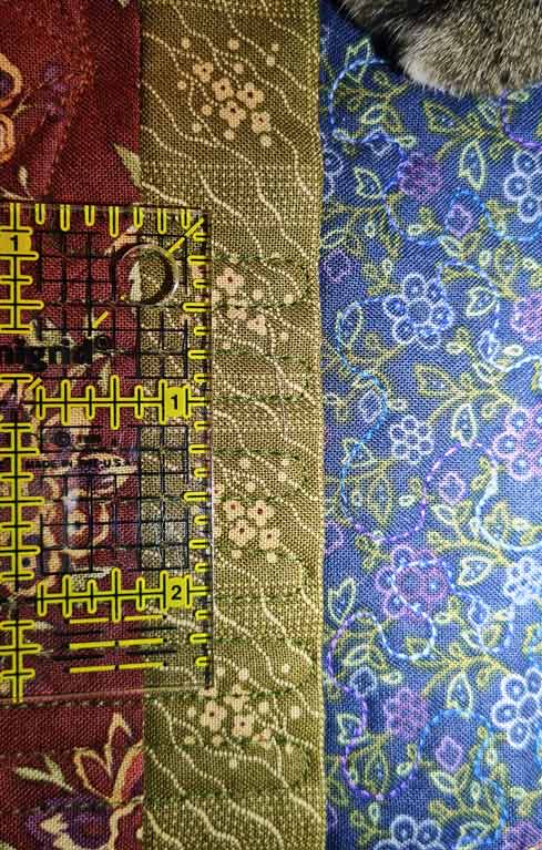 Hierboven zie je de kleuren nog naast elkaar. Groen (links op de foto) is het geworden. Door die richting te veranderen van boven naar beneden werden de lijnen veel regelmatiger. En de ruimte tussen de lijnen voelde ineens ook heel vertrouwd. Helemaal toen ik er een lineaaltje op legde – spontaan was het een kwart inch geworden. Geen wonder dat dat zo bekend voorkwam.