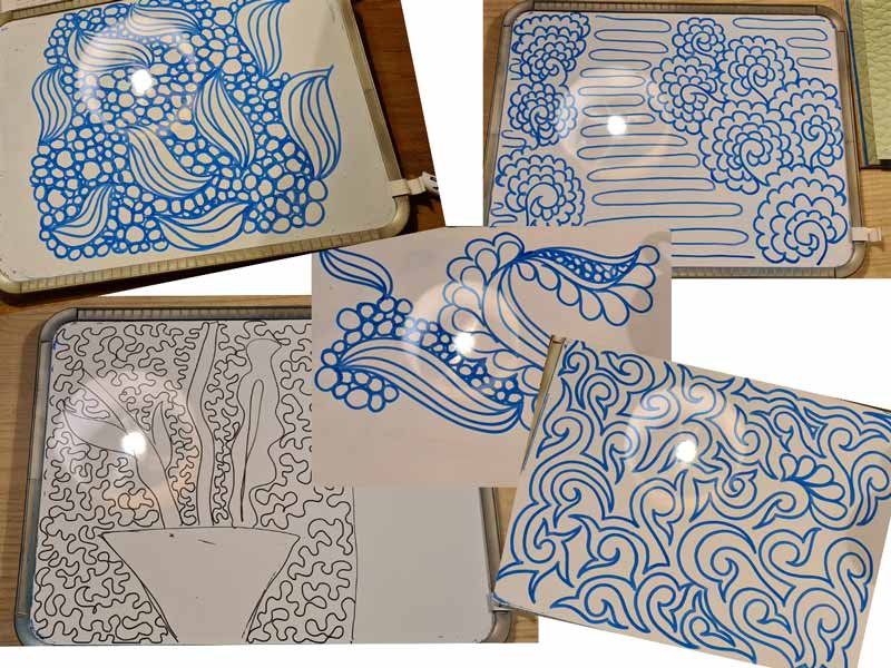 Om te bedenken wat ik met de achtergrond van de blokken wilde doen heb ik mijn vertrouwde whiteboard erbij gepakt. Ik ben een ferm aanhanger van het principe: “als je het kunt tekenen, kun je het quilten”. Ik heb van alles uit zitten proberen, zoals je ziet. Het is zo makkelijk met dat whitebordje. Vind ik het niks, is het zo weer uitgeveegd. Als het een beetje soepeltjes lukt om het bord te vullen met iets, maak ik er een foto van zodat ik het later weer als inspiratie kan gebruiken.