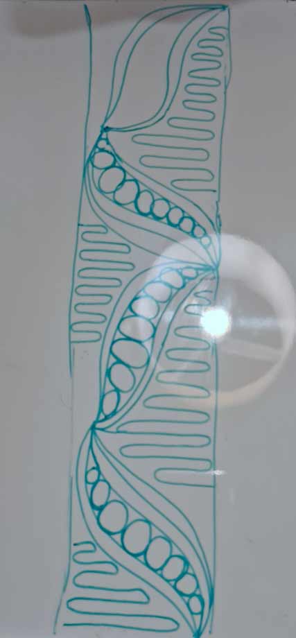 Ik vind het zo bijzonder hoe je tijdens het quilten je gedachten de vrije loop kunt laten en hoe je dan kleine hints kunt uitwerken tot volledige ideeën. Zo vormde zich tijdens het meanderen een idee over hoe ik de buitenrand wilde gaan maken. Een soort zaadlijst omgeven door een intensiever raster. En ja, weer het bordje erbij gepakt om te kijken wat er voor nodig was qua heen en weer bewegen om de vormen in een doorlopende lijn te kunnen maken.