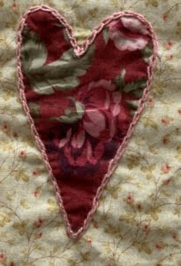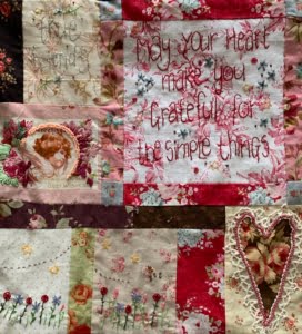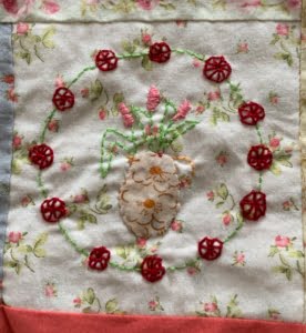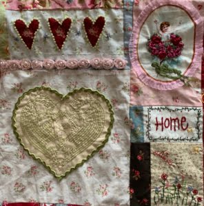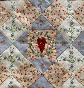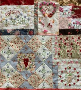 Het blok met hartje is gepatched en erna op geborduurd met DMC garen en kraaltjes…