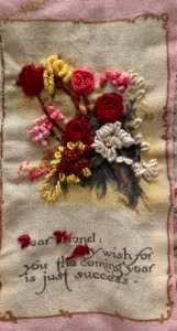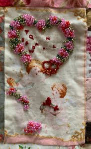 Deze keer een hart eenvoudig met een kettingsteekje…en een poëzieplaatje, op deze heb ik me helemaal uitgeleefd met Franse knoopjes, steelsteekjes, gewoon met borduurgaren en perle garen… ziet er schattig uit, vind je niet?