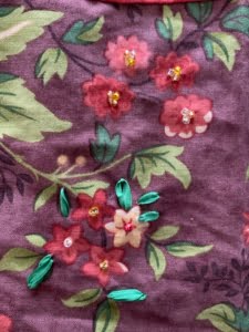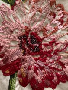 Met deze bloem ben ik echt al een tijd bezig, het zit vol met steelsteekjes en Franse knoopjes… de stof is net wat stugger dan gewone quiltstof dus het kost heel wat kracht om steeds het zijdelint door de stof heen te trekken…