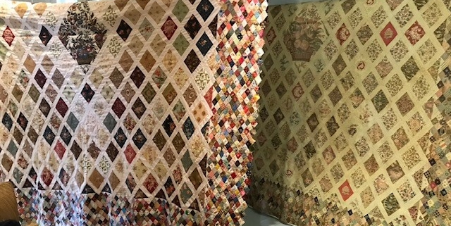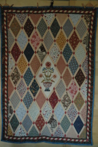 Carla Lekkerkerker bezocht enkele jaren geleden het Jane Austen Museum in Chawton in Engeland. Zij werd geïnspireerd door de originele quilt die Jane samen met haar moeder en zus heeft gemaakt. In het museum kocht zij het patroon en ging er thuis mee aan de slag. Het middenstuk is een reproductie van het origineel, opgevuld met extra bloemen. Voor de wybers gebruikte zij uitsluitend rozenstoffen. Maar voor de rand heeft zij naast rozenstoffen ook andere stofjes gebruikt. De rand bestaat maar liefst uit 1.250 stukjes. Elk diamantje zit er 2x in. De randen links en rechts en onder en boven zijn ten opzichte van elkaar zo’n 90% gespiegeld. Zij heeft geen vulling gebruikt maar alleen een achterkant toegepast omdat het origineel ook een coverlet is. 2 à 3 jaar nadat Carla haar quilt klaar had, is zij terug gegaan naar het Jane Austen Museum om haar quilt naast het origineel te fotograferen. En zie hier het resultaat.