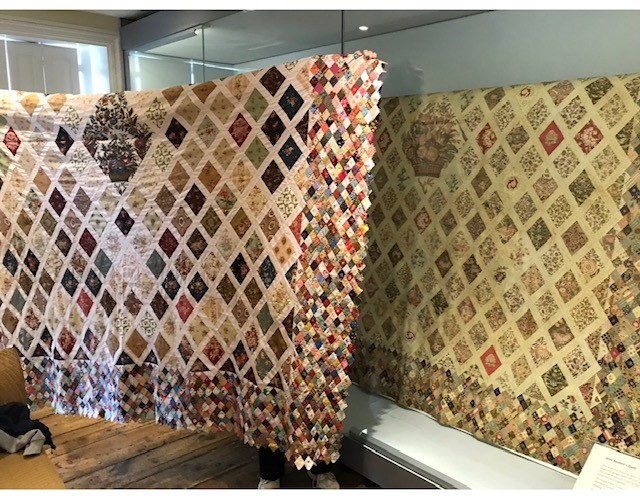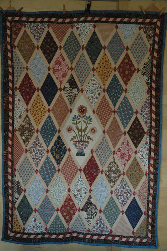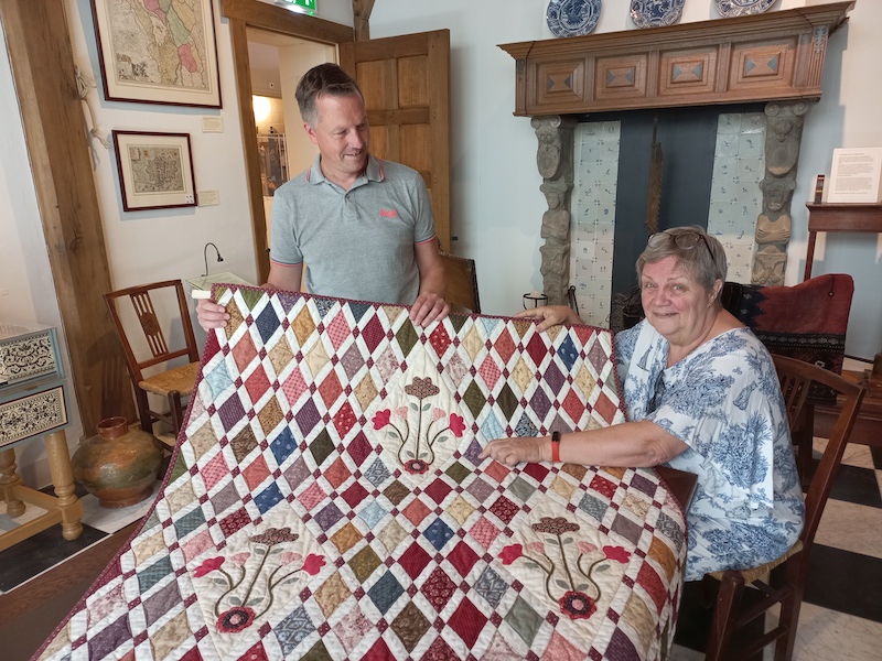 Carla Lekkerkerker bezocht enkele jaren geleden het Jane Austen Museum in Chawton in Engeland. Zij werd geïnspireerd door de originele quilt die Jane samen met haar moeder en zus heeft gemaakt. In het museum kocht zij het patroon en ging er thuis mee aan de slag. Het middenstuk is een reproductie van het origineel, opgevuld met extra bloemen. Voor de wybers gebruikte zij uitsluitend rozenstoffen. Maar voor de rand heeft zij naast rozenstoffen ook andere stofjes gebruikt. De rand bestaat maar liefst uit 1.250 stukjes. Elk diamantje zit er 2x in. De randen links en rechts en onder en boven zijn ten opzichte van elkaar zo’n 90% gespiegeld. Zij heeft geen vulling gebruikt maar alleen een achterkant toegepast omdat het origineel ook een coverlet is. 2 à 3 jaar nadat Carla haar quilt klaar had, is zij terug gegaan naar het Jane Austen Museum om haar quilt naast het origineel te fotograferen. En zie hier het resultaat.