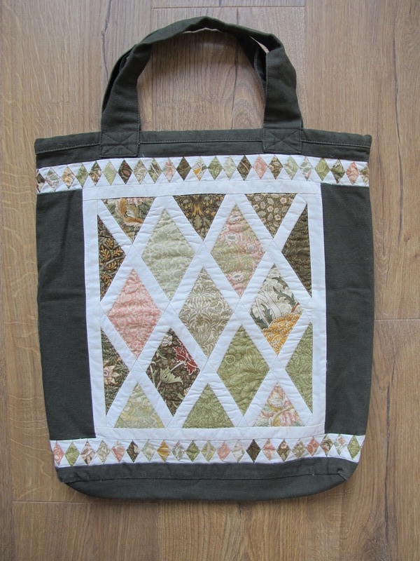 Sylvia Jansen had op een beurs een charm pack met stofjes van ca 12,5 x 12,5 cm gekocht, geïnspireerd op William Morris. William Morris was een ontwerper en heeft bekendheid verworven als de geestelijke vader van de Arts-and-Craftsbeweging. Sylvia wilde het patroon van deze stofjes goed laten uitkomen en kwam na een zoektocht uit op de ruiten in de Jane Austen quilt. De stoffen inspireerden haar tot het maken een een boodschappentas. Uit elk lapje van de charm pack kon een mooie ruit geknipt worden. Van de restjes heeft zij kleinere ruitjes gemaakt die zij voor de boven- en onderrand gebruikte. Met de witte stof uit haar lapjesvoorraad en de donkergroene canvas katoen van de markt completeerde zij in 2021 haar boodschappentas. Omdat dit geen groot project is geweest was de tas op redelijk korte termijn klaar.