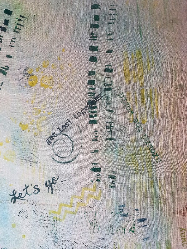 Lapje 2 is katoen. Dat is eigenlijk heel makkelijk voor een quilters. Katoen is de basis. Hier een stukje groenblauwe katoen van een monoprint op vastgezet en een stukje blauw geverfde scrim.