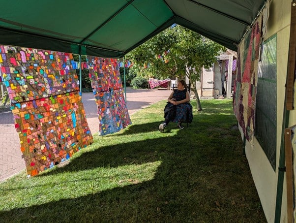 Het was leuk druk. Wat de gelegenheid gaf om in gesprek te gaan met de bezoekers en om ze te laten zien hoe quilten werkt. Het was ook leuk om te horen dat sommige mensen speciaal voor de quilts waren gekomen!