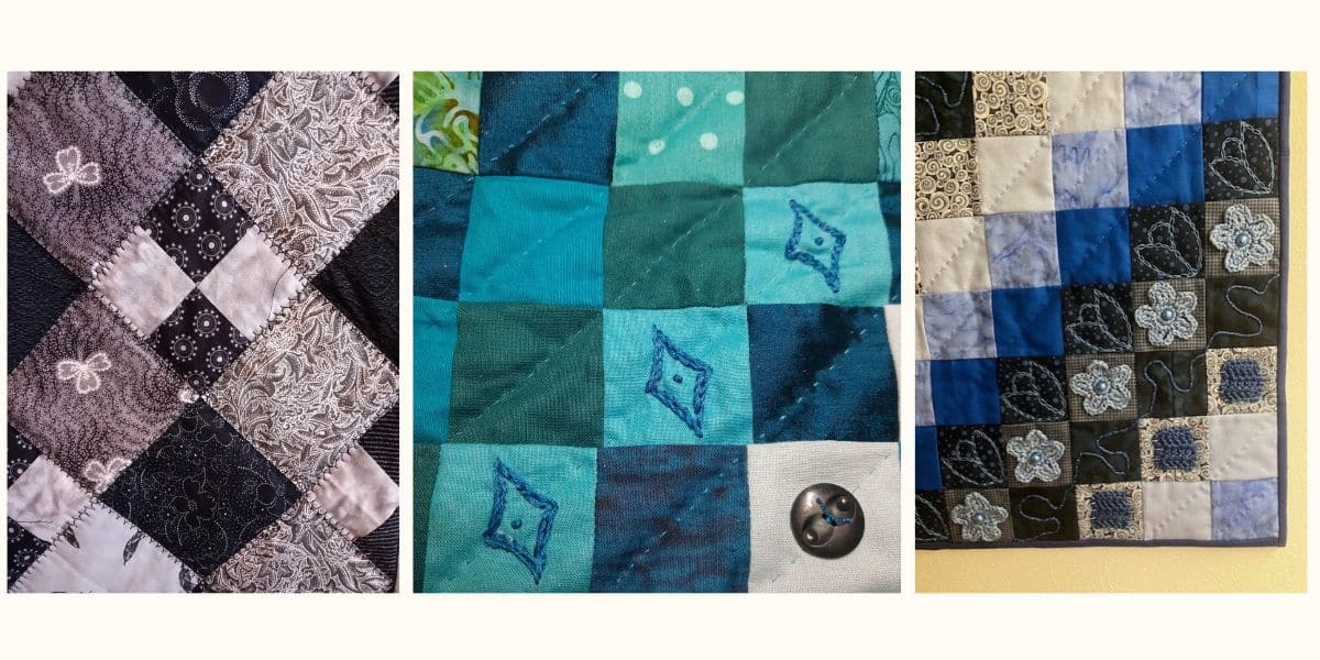 Op onze vraag om iets meer te vertellen over de quiltgroep beschrijven zij samen het volgende: “Alle leden hebben een heel eigen manier van werken en stijl, traditioneel, modern en art en alles wat er tussen zit. Dit geeft een hele leuke interactie binnen de groep en zo inspireren en versterken we elkaar… We volgen gezamenlijk of individueel cursussen en quiltdagen en geven de resultaten dan weer aan elkaar door. Ook bezoeken we natuurlijk beurzen mits dit i.v.m de afstand te doen is. We werken dus aan eigen projecten maar ook zeker aan groepsprojecten. We exposeren elk jaar tijdens de 3 daagse kunstroute “Kunst aan de Kust “ die in Zoutelande en omstreken gehouden wordt. https://kunstroutezoutelande.nl/.