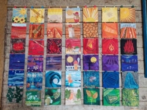 Soms werken we met een vastgestelde maat, een andere keer wordt dit vrij gelaten. Ook maken we een groepsopdracht, bijvoorbeeld met regenboogkleuren, of een zelfportret. Zo hebben we vorig jaar een groepsproject gemaakt waarbij we ieder quiltjes hebben gemaakt van 20 x 20 cm. volgens het volgende schema: Geel – zon, Oranje – aarde, Rood – Vuur, Paars (Violet) – nacht, Blauw – water, Groen – Bladeren. Deze hebben we met een tussenruimte van 1 cm op lint/band gezet en naast elkaar opgehangen.”