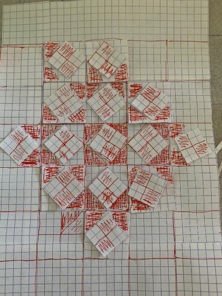 Ik ben eruit… allereerst ga ik aan het knippen en plakken… Het patroon teken ik eerst op ware grootte op H250… Dan Knip ik het uit, strijk ik het op de stof… Vervolgens spelden en naaien maar, en het blok zit strak in elkaar…