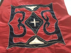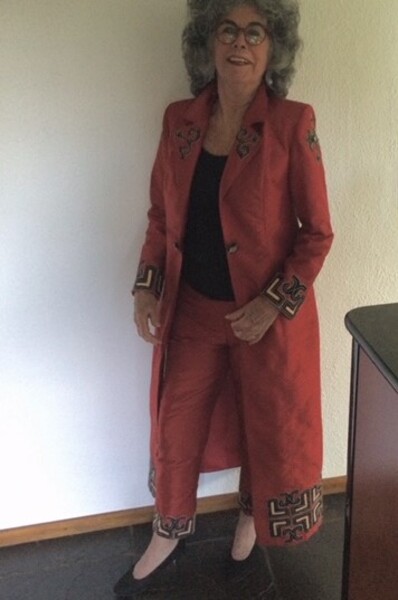 Daarna ontwierp zij een zijden jas met pantalon geappliqueerd en geborduurd met Ainomotieven. Dit lukte ook.