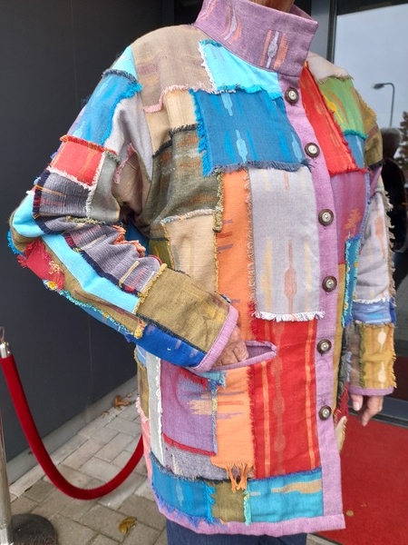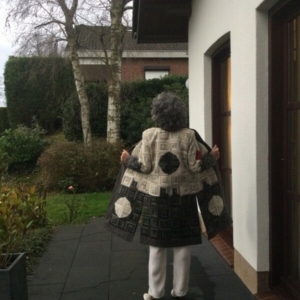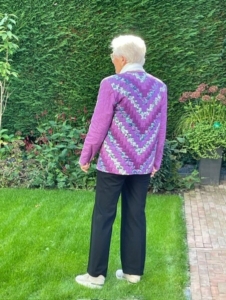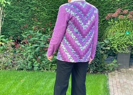 Ze vond het patroon erg mooi en is naar stof gaan kijken in den Briel. Ze had nog nooit zo´n grote quilt stoffen zaak gezien. En het was moeilijk om uit die grote keuze, de goede stof uit te zoeken. Het patroon was duidelijk dus ze kon aan de gang. Met veel plezier gemaakt en gedragen. In september is ze naar de Handwerkbeurs in de Brabanthallen geweest met haar jasje aan. Ze heeft heel veel complimenten gehad. Truus: “Ik zei dan dat het al 23 jaar oud was. Dat staat er niet op! Het jasje blijft mooi.”