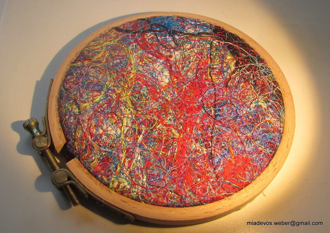 Wat had je altijd willen weten? Nou duidelijke filmpjes over het sneeuwverven, of hoe kan je leuke schaaltjes maken met draad en wateroplosbaar vlies, diverse filmpjes over mixed media of wat je kunt met organza. Maar om nou een hele dag naar dat scherm te zitten kijken trok me ook niet. Ik had ooit van die kleine borduurringetjes op de kop getikt en wat doe je daar dan mee? Nou mijn bak met draadjes legen en met wateroplosbaar vlies lekker op volle snelheid doorstikken,
