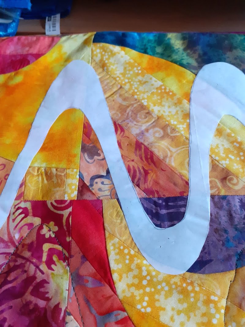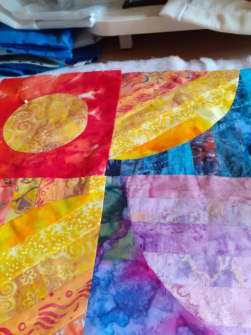 Wat heb ik nog niet gedaan, een paar dagen later kreeg ik van een lieve vriendin het boek Strips “n Curves van Louisa.L.Smit. Wel eens die gestreepte ballen gezien in een quiltblad maar daar nooit aan gedacht. Wat een kans om daar mijn energie in te steken. Toen viel het kwartje, gebruik nou eens wat er in je kast ligt. Kleuren bij elkaar gezocht en mijn lief gevraagd om de repen te snijden want dat lukte mij zittend niet zo goed. En dan gas geven en de repen aan elkaar maken en dat wordt dan een strata? Een lap met kleurige lijnen.