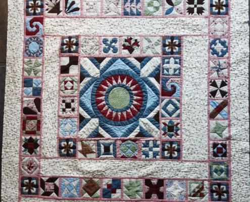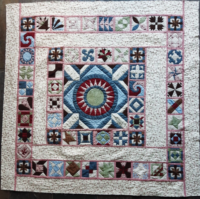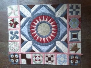 En ja, op de foto is het duidelijk te zien, de blokjes zijn niet goed. Ik heb waarschijnlijk een onderzettertje bij de goede blokjes gelegd. Maakt niet uit, met halfvolle moed weer verder. De bloemetjesranden er omheen. Alles netjes opgemeten, op maat geknipt, gesandwicht, gequilt en toen paste het weer niet. Stukken aan elkaar ‘gelast’, ik krijg die quilt wel passend.