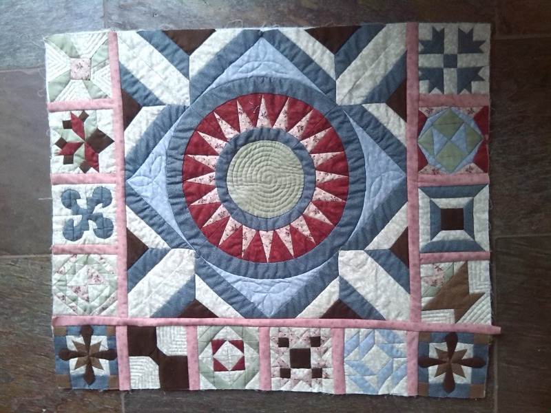 EQ8 aangeschaft. Ik had toen nog niet door hoe ik een Quilt-As-You-Go-quilt kon tekenen, maar ik dacht hé, wat maakt het uit, ik weet wat ik bedoel, ik druk gewoon die blokken af en maak het naderhand aan elkaar. Hoe moeilijk kan het zijn? Inderdaad, helemaal niet moeilijk, maar je krijgt wel een afwijking met de naadtoeslag. De rij blokjes wordt langer dan het middenblok. Geen punt, stof zat, onderzetters zijn altijd leuk.
