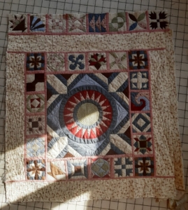 Ik vraag me af of het anders kan, of dat je het anders gedaan zou hebben met een moderne quilt. Dan kun je wellicht meer voortborduren (quilten in dit geval) op de fouten die je maakt? Een tip uit een boek vond ik inspirerend: toevoegen van ‘Coping strips’; stukken of repen stof herhalend verwerken nadat en waar de ‘fouten’ ontstaan. Misschien wordt het dan minder een drama, maar eerder uitdagend, speels, en zeker modern. (Boek in bibliotheek Quiltersgilde te leen: Cindy Grisdela: Adventures in Improv quilts).