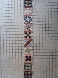 De blokjes met een ruime naadtoeslag, zodat ik ze goed passend kan snijden. Maar eerst nog eens narekenen. De blokjes weer in een rij.