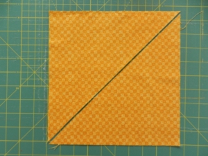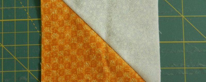 Dat zijn van die vierkanten, die uit 2 driehoeken bestaan. Die kun je snel maken door 2 vierkanten op elkaar te leggen, een diagonaal te tekenen en aan beide kanten van die diagonaal een naadtoeslag te naaien. Doorsnijden (of knippen) op de getekende diagonale lijn en voilà, 2 vierkanten, elk bestaande uit 2 driehoeken. (Het snijden van de HST’s leg ik in de volgende blog uit.