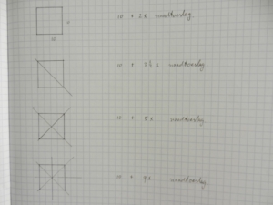 Door die diagonaal worden de vierkanten iets kleiner dan de twee vierkanten waar ik mee begon. Probleem. Gelukkig is daar een oplossing voor, een simpel rekensommetje. Voor mijn blok had ik echter niet alleen meerdere formaten nodig, maar ook meer dan 2 van die HST’s.