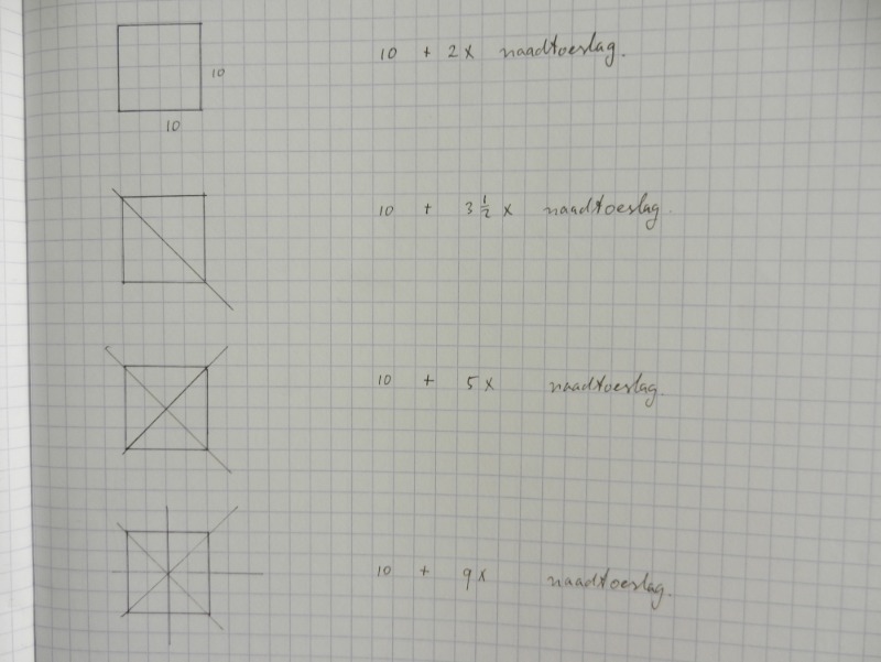 Bedankt Gerie! We hadden het er al even over bij de Meet & Greet en ik wist het ook al zo’n beetje, maar het is wel goed om het opgeschreven te zien en terug te kunnen vinden, met foto’s en al. Het is bijna net zoals ouderwets koffie zetten met een filter: een schepje koffie per kopje en een voor de pot; nu is het bij een blok: per snijmoment een naadtoeslag en een naadtoeslag erbij tellen voor het geheel. Zo probeer ik het te onthouden, hahaha.