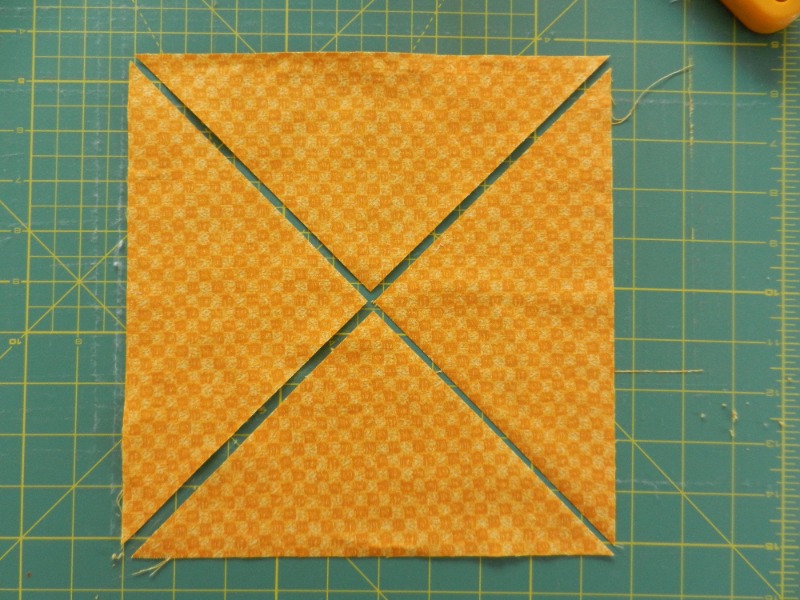 Wil je blokken, bestaande uit vier driehoeken, of heb je vier halve blokken nodig in je quilt, dan moet je de vierkanten twee keer diagonaal doorsnijden (of knippen). Hiervoor snijd (of knip) je steeds een vierkant van 10cm + 5x de naadtoeslag.