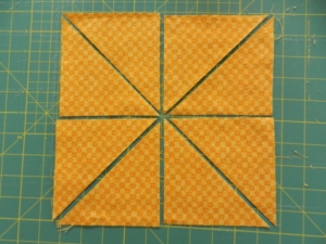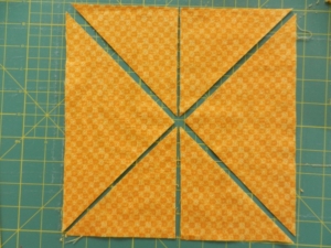 Wil je blokken bestaande uit acht driehoeken, of heb je 8 halve blokken nodig in je quilt, dan moet je de vierkanten 2x diagonaal doorsnijden én twee keer door het midden, horizontaal en verticaal.