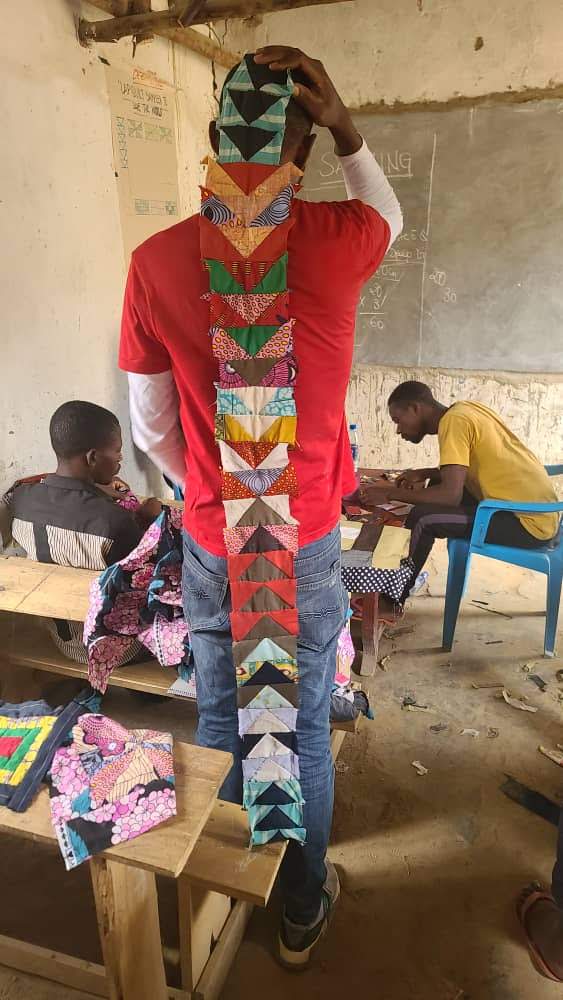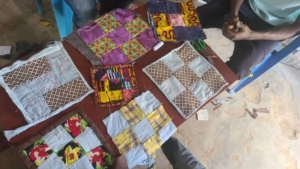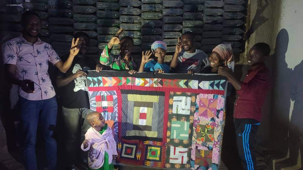 Ze waren zelf al bezig met kunst van zwerfplastic, zoals je op de foto kan zien. Ze hadden interesse om ook textiel afval dat rondslingert in het kamp om te zetten in waarde. Zo zijn ze bij mijn quilt lessen terecht gekomen. In het kamp is er een groot probleem met een overschot aan kleding dat gedumpt wordt. Na een leuke kennismaking zijn we begonnen met de ‘A Taste of Quilting’ (‘een Voorproefje Quilten’) workshop waarbij deelnemers leren een mini memory quilt te maken met kleding dat wat voor ze betekent. Daar heb ik in het vorige artikel over verteld. In dit artikel vertel ik over de vervolglessen.