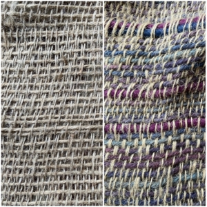 Inmiddels is de onderlaag voor de steekproeverij klaar. Na mijn onbesuisde aankoop van een weefgetouw bij de kringloop vorig jaar februari heb ik na heel veel gestoei mijn doel bereikt; een ketting van naturel jute met een inslag van geverfde jute en wollen draden.