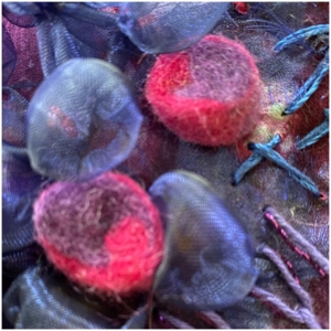 Voor het borduren is mijn werktitel onder de oppervlakte en de inspiratie haal ik uit het boek Zeewieren waarin de prachtigste foto’s staan van de in ons land voorkomende wieren. Als kind opgegroeid aan de Waddenkust glibberde ik er overheen en stond ik in de zee om wieren uit het water te vissen. Natuurlijk kan ik het onderwerp onder de oppervlakte ook veel breder trekken. Wat speelt er onder de oppervlakte van een persoon, een gezin, een familie, een groep, een land? Het is een onderwerp waarop ik eindeloos kan doorborduren. Maar eerst stort ik mij op de Hypoglossum hypopglossoides oftewel Tongwier. De kleur is roze tot rood.