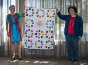In samenwerking met De Broodfabriek te Rijswijk besloten we in 2022 een extra Algemene Tentoonstelling in te richten. Er was veel te zien: de quilts waarvan een kaart was gemaakt, een deel van de EQA quilts Threads without borders, quilts van leden, de inzendingen van de art quilt wedstrijd Grenzen aan de groei, de Oriënt Express quiltjes van SAQA en nog veel meer. We hebben veel leden ontmoet en ook nieuwe leden geworven. De kleurrijke nieuwe ledendoos heeft daar zeker aan bijgedragen.