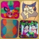 Ze zijn te klein om veel tekening aan te kunnen brengen. Het is de vorm die duidelijk maakt dat het om eendjes gaat. Maar een eendje van opzij geeft een ander beeld dan een eendje van achteren, dat is slechts een rondje. Een bruin lapje heb ik verstevigd met …… Nadat dit goed droog was, heb ik er de kleine eendjes uitgeknipt. Ieder eendje een tipje goudverf gegeven en een tipje witte verf en die verf wat verdeeld om daarmee de tekening van verendek en snavel te maken. De eendjes zijn met de hand vastgezet op de ondergrond.