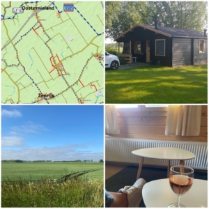 Woensdagmiddag ga ik richting Noord Groningen. Het huisje bij het dorpje Zeerijp vinden is even een ding. Via een heel smal weggetje kom ik op een boerenerf en daar staat ergens het huisje, maar waar????? Na wat rondjes over het erf zie ik achter een paar enorme aardappelkisten een weggetje en Yes daar aan het eind vind ik het chaletje. Waar ik al een beetje bang voor was wordt werkelijkheid, ik heb ruzie met de code van het sleutelkastje. Na heel vaak proberen blijft de sleutel onbereikbaar. Ik besluit op zoek te gaan naar de verhuurder en hoe ik ook zoek, roep en uiteindelijk in de keuken sta, er is niemand te vinden. Na een sms’je verschijnt gelukkig de boerin. Na een super leuk gesprek neem ik mijn intrek en maak ik er in mijn eentje een rustige avond van in de middle of nowhere.