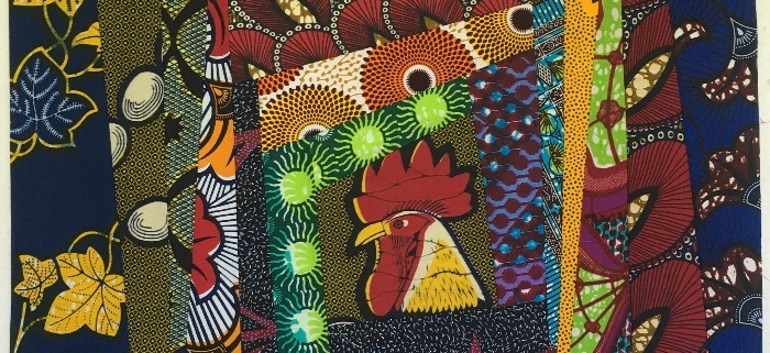 Traditioneel is het middelste vierkantje, het vuur, rood van kleur. Dus neem ik het hoofd van de haan met de rode kam. Daaromheen naai ik stroken met verschillende breedtes vast. Bij elke nieuwe strook selecteer ik een nieuwe kleur die goed ‘aanvoelt’, ik heb dus geen vooropgesteld plan.