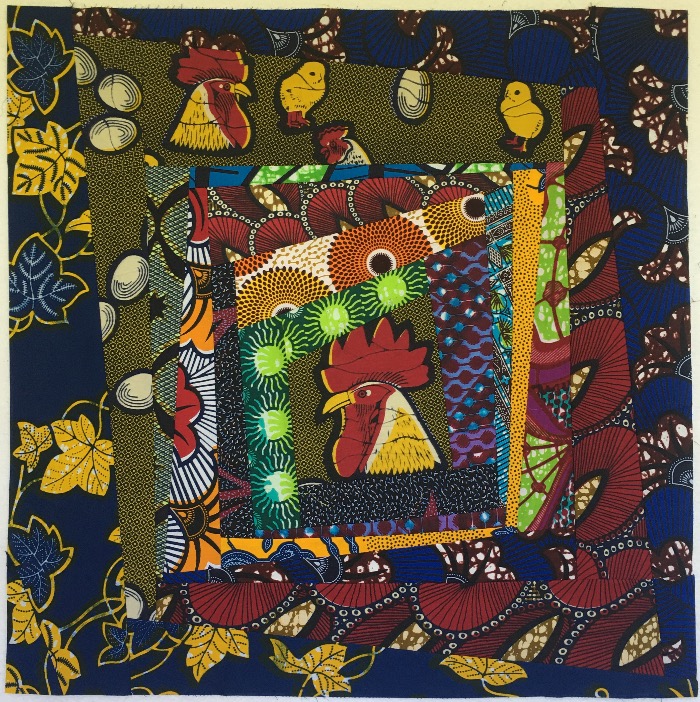 Traditioneel is het middelste vierkantje, het vuur, rood van kleur. Dus neem ik het hoofd van de haan met de rode kam. Daaromheen naai ik stroken met verschillende breedtes vast. Bij elke nieuwe strook selecteer ik een nieuwe kleur die goed ‘aanvoelt’, ik heb dus geen vooropgesteld plan.