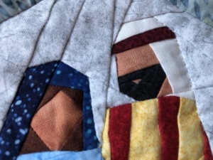 En toen aan het werk. Ik heb niet de dagvolgorde aangehouden maar begon met een blok dat me niet zo moeilijk leek. Dat lukte wonderwel en ik werd steeds gemotiveerder. De patroondeeltjes werden steeds kleiner maar met paperpiecing is dat eigenlijk geen probleem. Ook het kleinste deeltje (de mond van Jozef, 3 x 1 mm) ging goed.