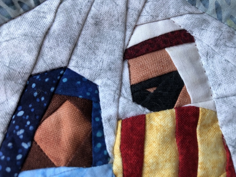 Het quilten heb ik heel summier gehouden omdat de quilt al druk genoeg was. De omtrek van de figuren heb ik in de naad gequilt en in de rand heb ik sterren gemaakt.