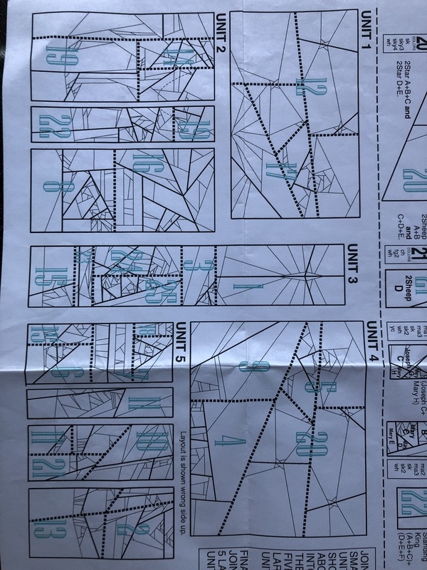 Het patroon is zo opgebouwd dat je verschillende blokken kunt samenvoegen tot 5 verschillende ‘units’ die je tenslotte aan elkaar zet tot je de hele quilt af hebt.