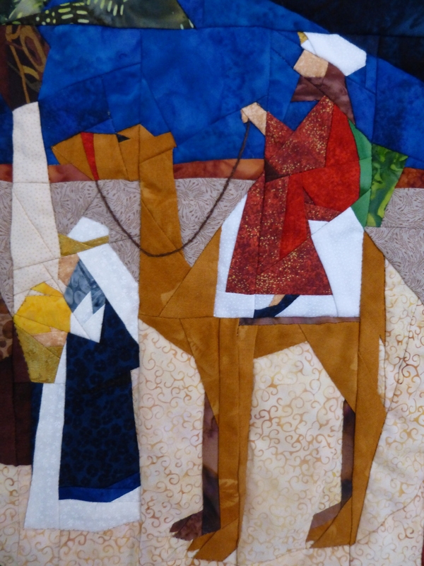 Bij de stand van het Quiltersgilde sprak ik Inge van Koningsveld en vertelde dat ik die quilt zo geweldig vond. O, zei Inge, de mevrouw die de quilt heeft gemaakt staat hier vlakbij! Dat was een bof, ik sprak die mevrouw aan (helaas weet ik haar naam niet) en zij vertelde dat zij het paperpiecing patroon van de quilt had gekregen van een vriendin die was overleden. Zij had het anderhalf keer vergroot en had toen die quilt gemaakt: Advent Nativity van Linda Worland.